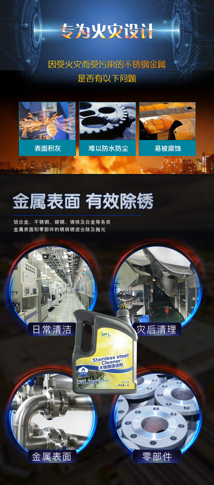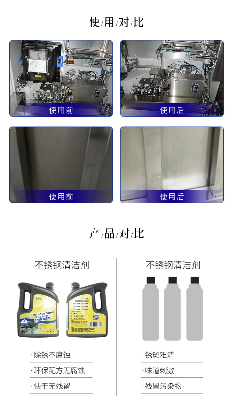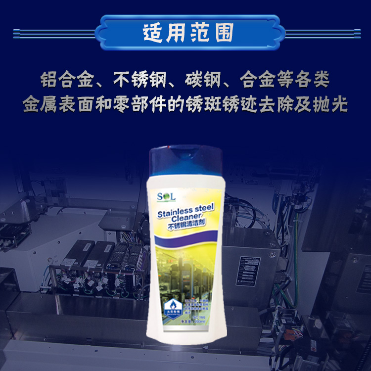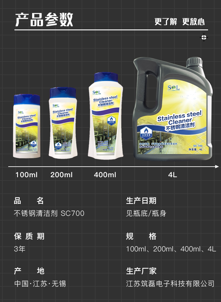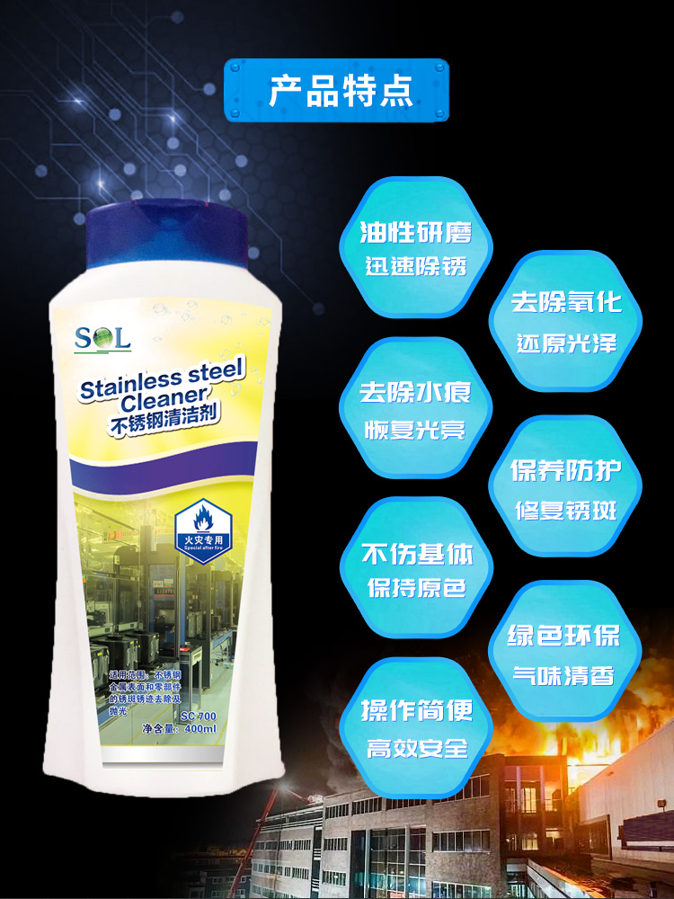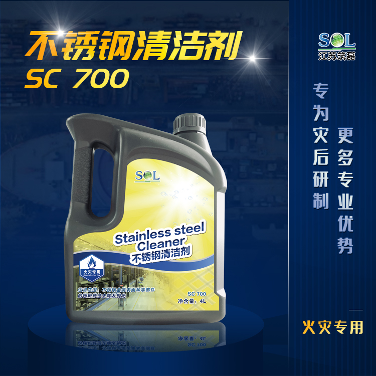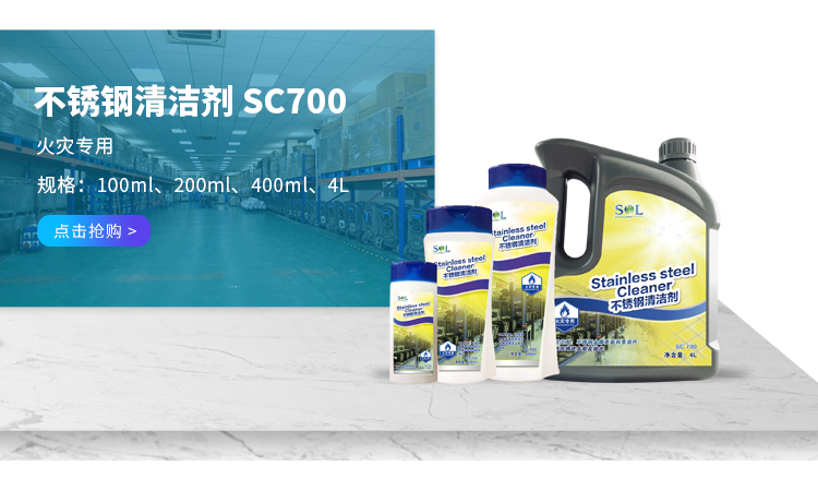 - • ステンレスクリーナーSC 700は強力な汚れ落とし能力があり、腐食性がなく、素材を傷めず、傷もつきません。使い方も簡単で、1回にスプレーし拭き取ると、表面の光沢を取り戻すことができます。この製品は強力な汚れ落とし能力とスプレー設計を備えており、より便利で素早く使用できます。ステンレス製設備及び各種類のステンレスの表面に広く適用されています。