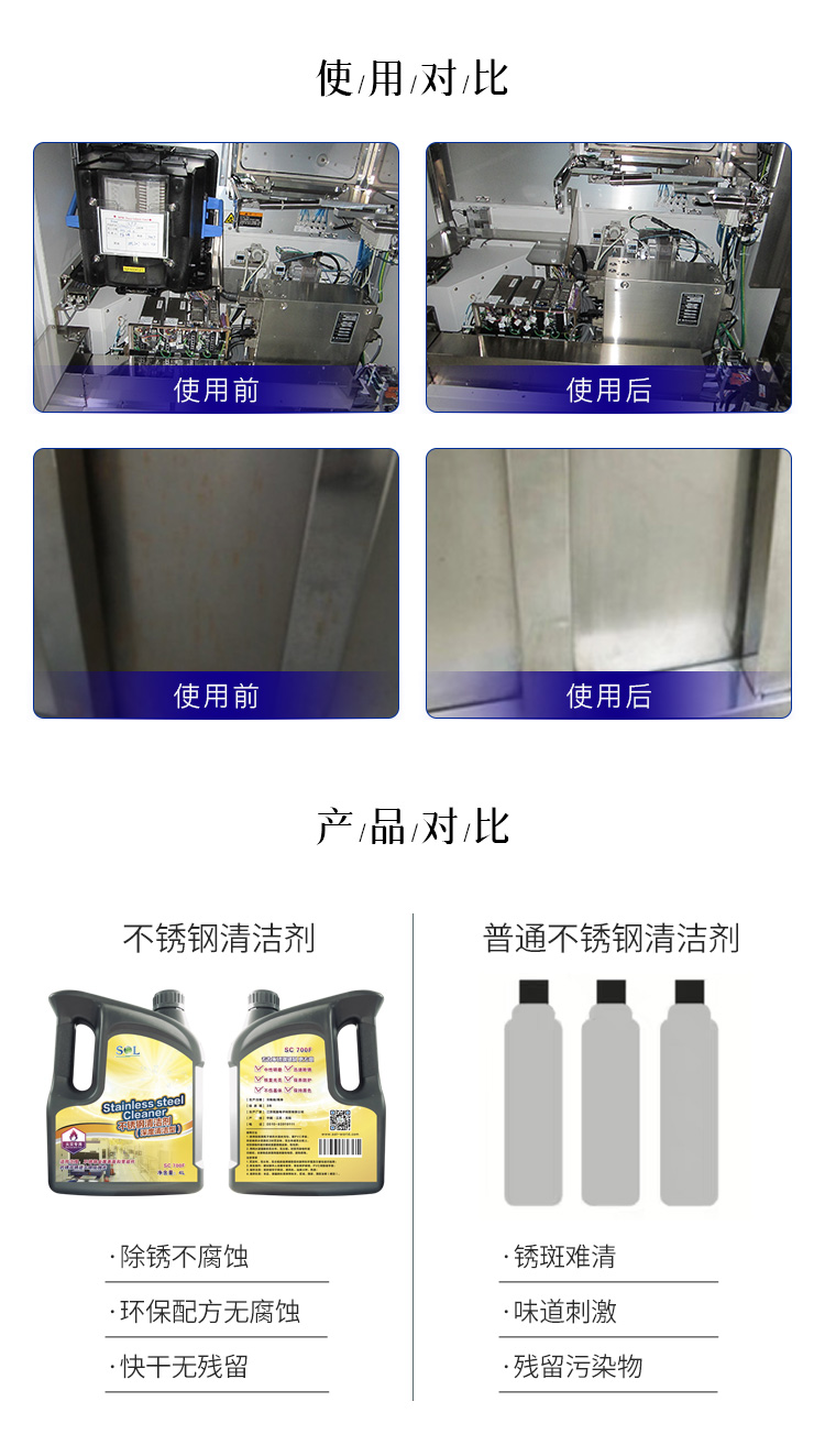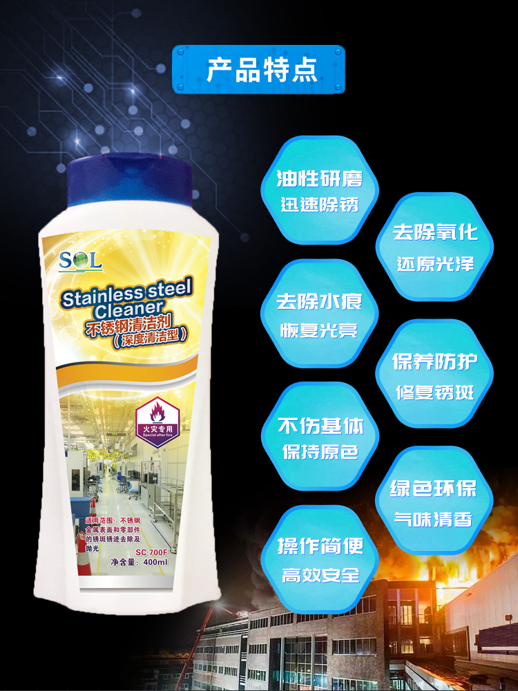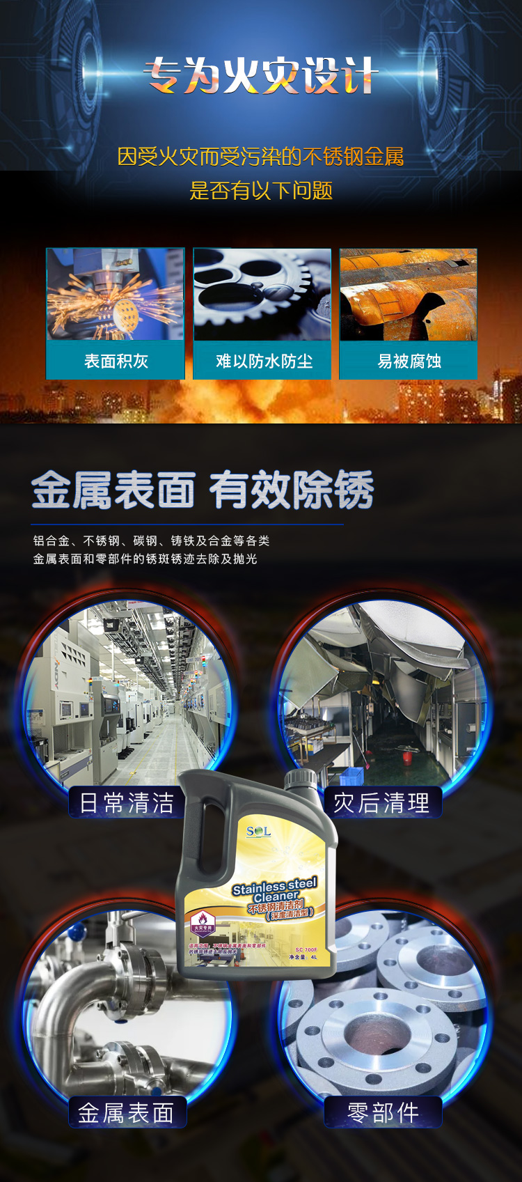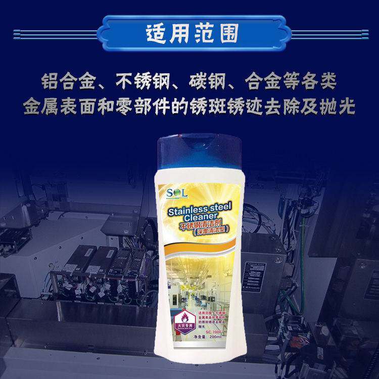 - • SC 700Fは金属酸化物を溶解し、汚染物質を洗浄し、錆を深く除去することができます。本品はサビの程度等に応じ、濃度や除錆時間を調整することができますが、通常にスプレー、ブラッシング、浸漬を行い、3~5分間できれいに洗浄可能です。工場機械、自動車、金属部品及び各種類のステンレス部品表面など幅広い業界で使用されています。