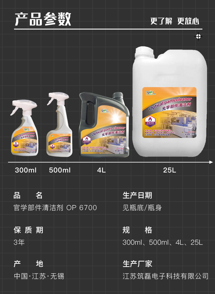 - • 光学パーツクリーナーOP 6700は、光学部品や光学ガラスに付着している油汚れなどの汚れを簡単に除去し、油汚れや水溶性の汚れを素早く溶解することができます。この製品は、レーザー加工機のレンズ、スキャナーガラス、顕微鏡などの光学ミラーやメッキ面に使用されます。